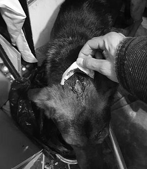 « Ne sachant pas quelles pouvait être les réactions de l’animal, des agents de la Compagnie cynophile de Paris étaient présents en cas de besoin pour le maîtriser, précise Arnauld Lhomme. C’était, en fin de compte, un amour de chien ! ». Amené à la clinique vétérinaire en urgence, l’état de santé critique du Berger allemand a nécessité plusieurs jours de soins.
