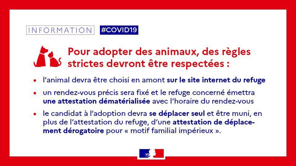 De son côté, la Fondation 30 Millions d’Amis appelle à la plus grande vigilance ! Il conviendra de faire toute la pédagogie et la sensibilisation pour que l’on n’assiste pas dans les jours qui viennent à des adoptions « low-cost » de circonstance, de personnes confinées qui tout à coup souhaiteraient trouver une compagnie opportune, de personnes qui verraient dans cet animal adopté à la hâte un motif supplémentaire de sortie dérogatoire