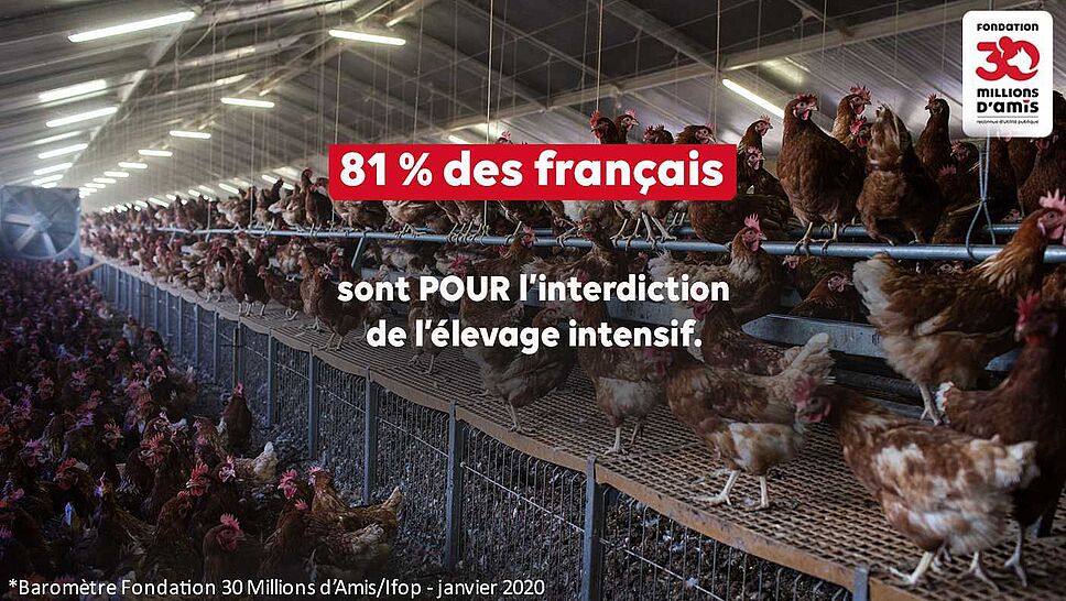 Les acteurs industriels doivent réagir de façon unanime et prendre (enfin !) en compte l’intérêt des consommateurs pour le bien-être animal : plus de 8 Français sur 10 s’opposant à l’élevage intensif (Baromètre Fondation 30 Millions d’Amis / Ifop – 2020). Par ailleurs, la Fondation 30 Millions d’Amis se mobilise auprès des instances publiques en soutenant le Référendum d’Initiative Partagée pour les animaux, qui propose notamment d’interdire les cages et de mettre fin à l’élevage intensif.
