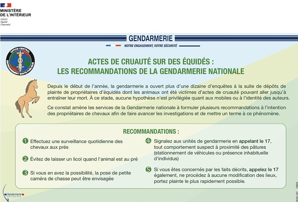 Parce qu’aucune hypothèse n’est encore privilégiée quant aux mobiles ou à l’identité des auteurs, la Gendarmerie nationale a formulé plusieurs recommandations et plus précisément à l’égard des propriétaires de chevaux. Il leur revient ainsi de « réaliser une surveillance quotidienne des chevaux aux près et d’éviter de laisser un licol quand l’animal est au près ». La pose de dispositifs de vidéo-surveillance devrait, dans la mesure du possible, être privilégiée. Enfin, il importe de « signaler aux unités de gendarmerie – en appelant le 17 – tout comportement suspect à proximité des pâtures (stationnement de véhicules ou présence inhabituelle d’individus) ». En cas de mutilation avérée, une plainte doit être déposée auprès des services de gendarmerie, mais aucune modification des lieux ne doit être effectuée. Le respect de ces préconisations est indispensable à la réussite des investigations.