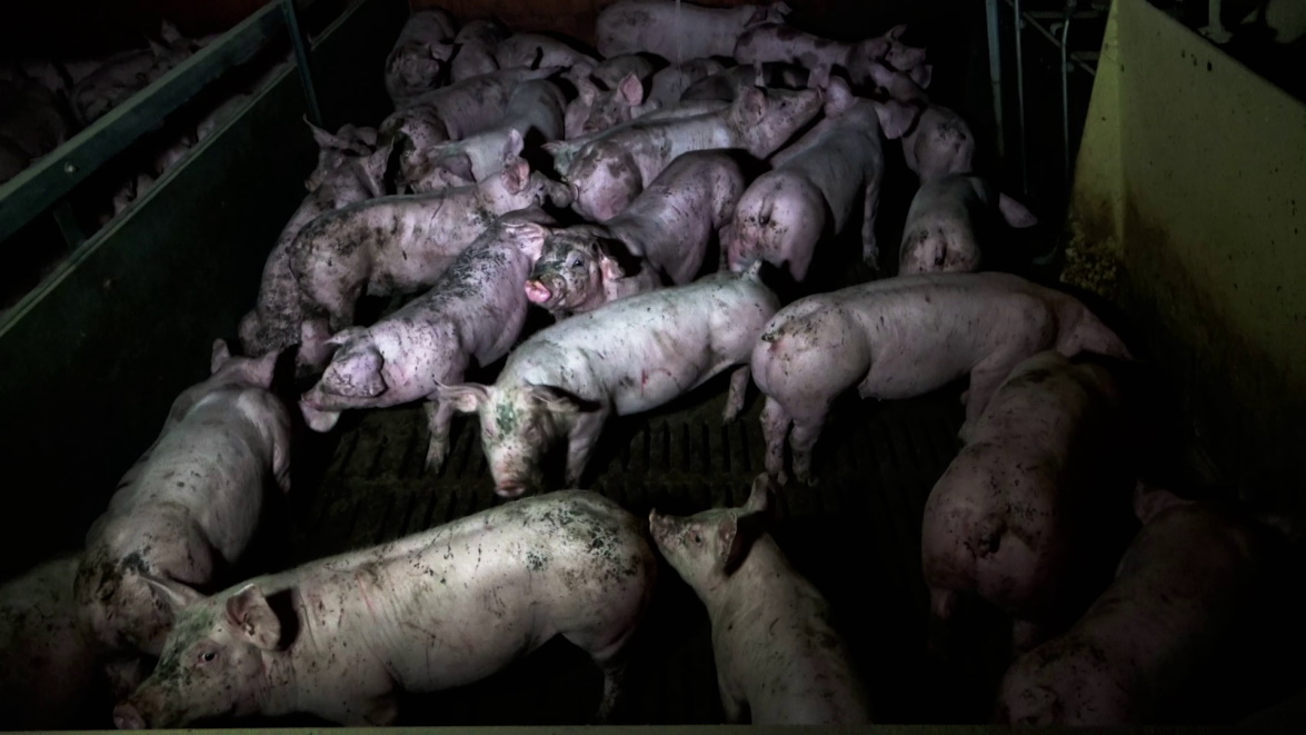 Les cochons visibles sur les images tournées en janvier 2021 dans cet élevage ont tous la queue coupée, alors qu’il est interdit de pratiquer cette mutilation de manière systématique. ©L214