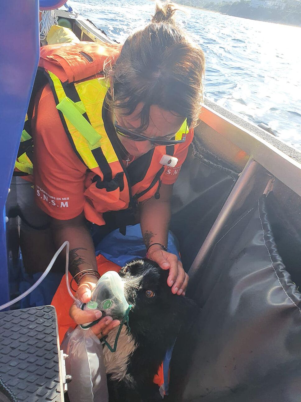 Les sauveteurs hissent alors le Border Collie sur leur navire. « Je lui ai mis une couverture pour le réchauffer, puis nous l’avons tout de suite mis sous oxygène, précise la sauveteuse. Il a gardé le masque (à oxygène) sur son museau… On aurait dit qu’il comprenait ce qu’on faisait. J’ai retiré mes lunettes de soleil et il a plongé son regard dans le mien. C’était un moment magique. » De retour au port, l’équipe attend l’arrivée des pompiers, prévenus afin d’assurer le transfert de l’animal vers une clinique vétérinaire. C’est alors qu’un deuxième miracle se produit ! « Quelqu’un sur le quai a lancé : « Je le connais, ce chien ! » », se remémore Laurence. Le Border Collie ferait l’objet d’une annonce « chien perdu » sur Pet Alert. L’équipe consulte ladite annonce… et constate que l’animal semble en effet correspondre au descriptif.
