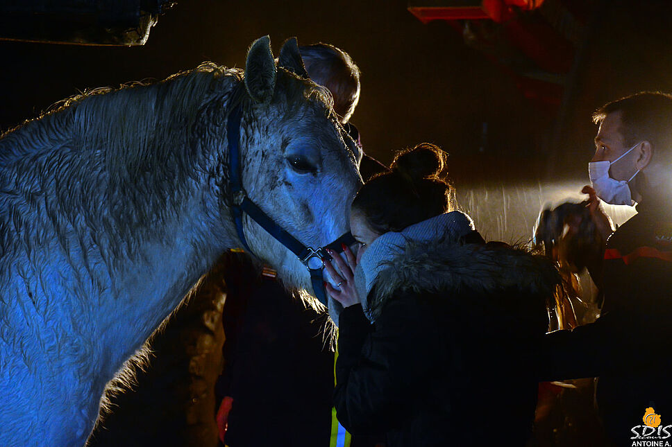 Les pompiers ont réconforté le cheval tout au long de l'intervention de secours, le soir de Noël. ©Aymeric Antoine -SDIS 21