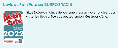 Le Petit Futé 2022 n’est pas en reste non plus, présentant les « ânes taxis » comme « un moyen original pour visiter le village grâce à de petites randonnées à dos d’âne » !
