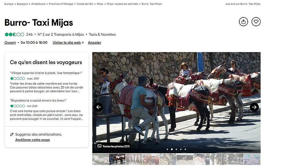 Tout aussi choquant, 30millionsdamis.fr a noté que les « burro-taxis » de Mijas font figure d’attraction touristique sur le site de Trip Advisor. L’activité y est classée dans la section « transports », ce qui ne manque pas d’enflammer les commentaires : « Traiter les ânes de cette manière est une honte. Ces pauvres bêtes attachées avec 20 cm de corde peuvent à peine bouger, en attendant leur tour pour supporter les poids des touristes fainéants en plein soleil. Mijas pueblo est superbe mais À PIEDS !!! Stop à ces traitements !!! », « Anes debout pendant des heures qui ne peuvent meme pas bouger la tête. Pas d’eau disponible pour eux. Honteux et maltraitant » ou encore « C’est une honte que cela puisse exister ! Les ânes sont maltraités, laissés en plein soleil , sans eau, ne peuvent pas bouger ni se coucher, ils sont frappés ».