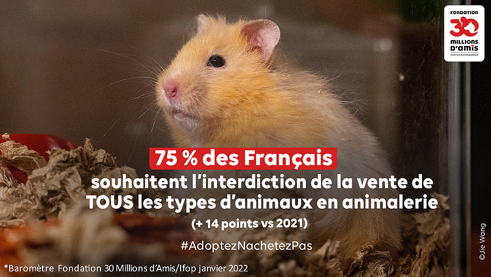 Pour lutter efficacement contre la marchandisation des animaux de compagnie, responsable de milliers d’abandons chaque année, la Fondation 30 Millions d’Amis réitère sa demande tendant à généraliser l’interdiction de la vente en animalerie à tous les animaux de compagnie : seule solution à même de lutter contre les achats compulsifs et le trafic d’animaux. Un voeu partagé par l’opinion publique puisque selon le baromètre annuel de la Fondation 30 Millions d’Amis mené avec l’Ifop, trois quarts des personnes interrogées (75 %) demandent l’interdiction totale de la vente de tous les animaux de compagnie en animalerie (+14 pts depuis 2021).