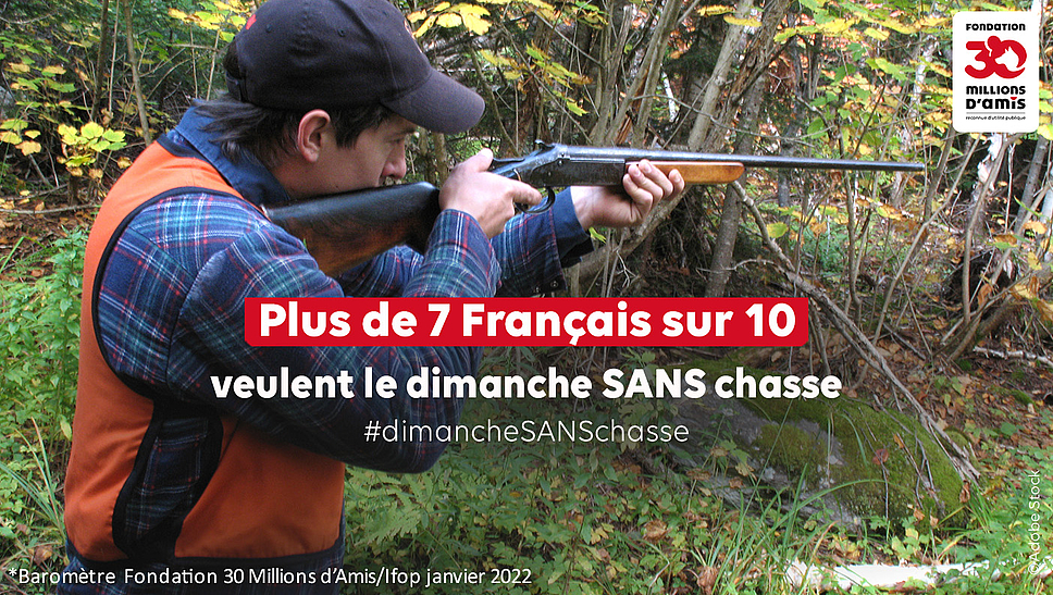 « Ce résultat va à contre-courant des attentes sociétales », dénonce de son côté l’association Animal Cross. Et pour cause, 76 % des Français sont pour l’interdiction de la chasse le dimanche (Baromètre Fondation 30 Millions d’Amis /Ifop, 2022). Dans cette lignée, afin de permettre aux promeneurs de jouir de la nature en toute sérénité les fins de semaine, la Fondation 30 Millions d’Amis a lancé une pétition pour des week-ends sans chasse.