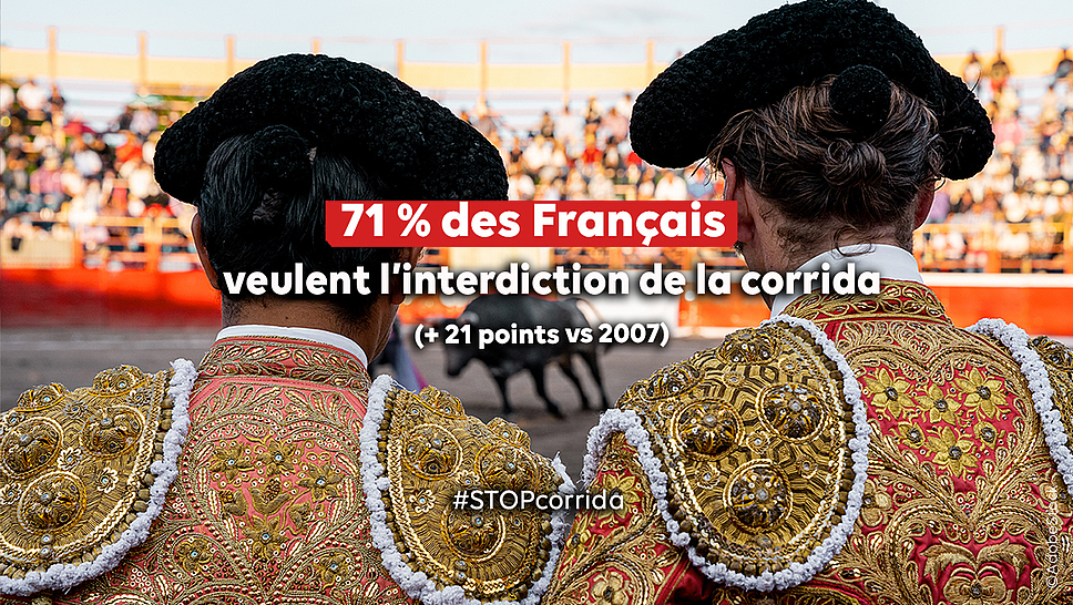 Parmi ces traditions invoquées, la corrida cristallise toujours autant le rejet des Français., notamment des plus jeunes : en effet, 77 % des 18-24 ans et même à 81% des 25-34 ans sont favorables à l’abolition de la corrida. Chez les femmes de moins de 35 ans, la demande atteint même 86 %.