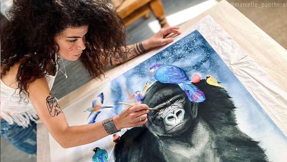 Empruntant le prénom de sa « grand-mère maternelle qui a 97 ans », une « figure inspirante qui peignait beaucoup », celle qui naît Louise Collas devient donc Marcelle Panthère, l’artiste. Et plus rien ne l’arrête. Armée de son pinceau, d’aquarelle et de «pigments métallisés », elle voue son art à la protection animale, une thématique qui lui est chère. « Quand je peins un animal, je vais à sa rencontre. Si je crée un cerf, je regarde des vidéos, je lis des articles, je me renseigne sur son histoire pendant deux semaines… Mes tableaux sont un prétexte pour parler de ces sujets », explique la jeune femme.