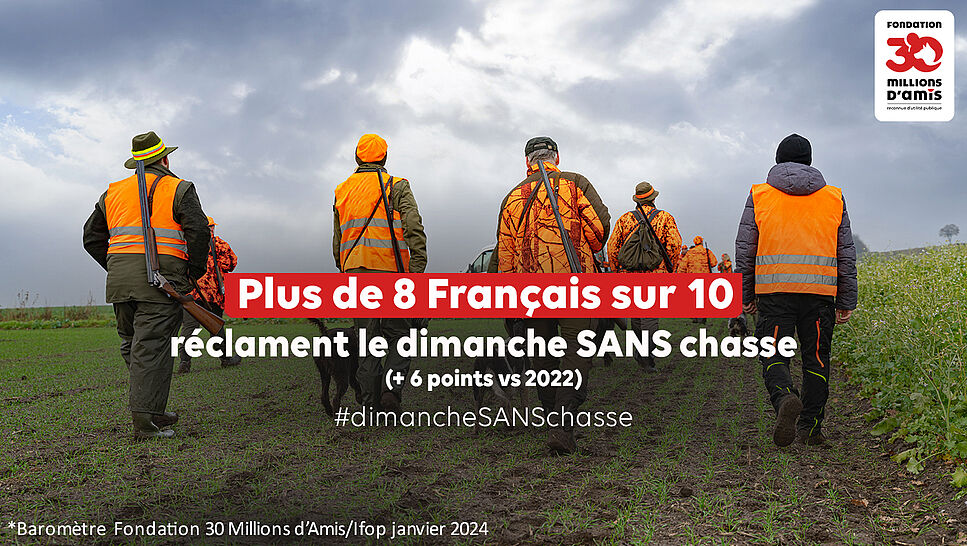 La possibilité de chasser 7 jours sur 7 en saison de chasse représente un frein inconditionnel à la tranquillité des ruraux. Familles, randonneurs ou encore des cyclistes fréquentent les espaces naturels le dimanche, les jours fériés et lors des vacances scolaires. Afin de préserver leur sécurité et donner un peu de répit à la faune sauvage, 82 % des Français se sont déclarés favorables à l’interdiction de la chasse le dimanche [Baromètre Fondation 30 Millions d’Amis / IFOP – 2024].