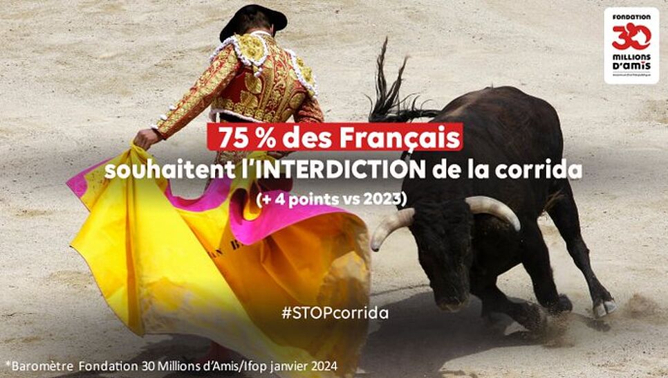 Selon le baromètre annuel de la Fondation 30 Millions d’Amis mené par l’Ifop, 75 % des Français sont favorables à la disparition de la corrida sur notre territoire. C’est 4 points supplémentaires qu’en 2023. La pétition de la Fondation 30 Millions d’Amis qui demande son interdiction recueille déjà plus de 457 000 signatures. En dépit de cette franche opposition à cette pratique cruelle, le législateur – en déconnexion totale avec l’opinion – ne franchit même pas l’étape de leur interdiction aux moins de 16 ans !