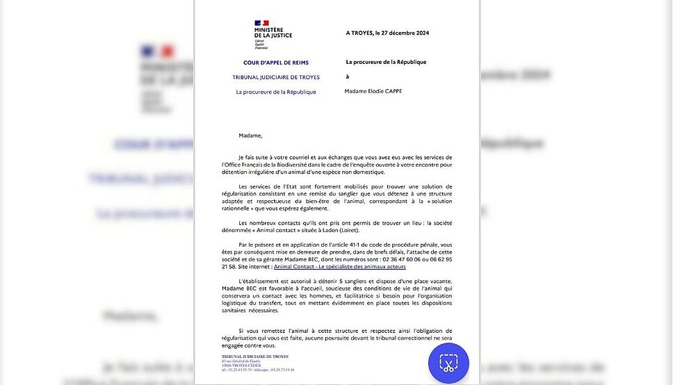 C’est par le Tribunal judiciaire de Troyes, dans l’Aube, qu’Elodie Cappé a appris le sort que l’État entend réserver à Rillette, la laie qu’elle a sauvée lorsqu’elle était encore un marcassin, puis adoptée. Dans son courrier daté du 27 décembre 2024 – que 30millionsdamis.fr s’est procuré – la procureure de la République met « en demeure » la jeune femme de confier l’animal « dans de brefs délais » à « la société dénommée ‘’Animal Contact’’ située à Ladon (Loiret) ».