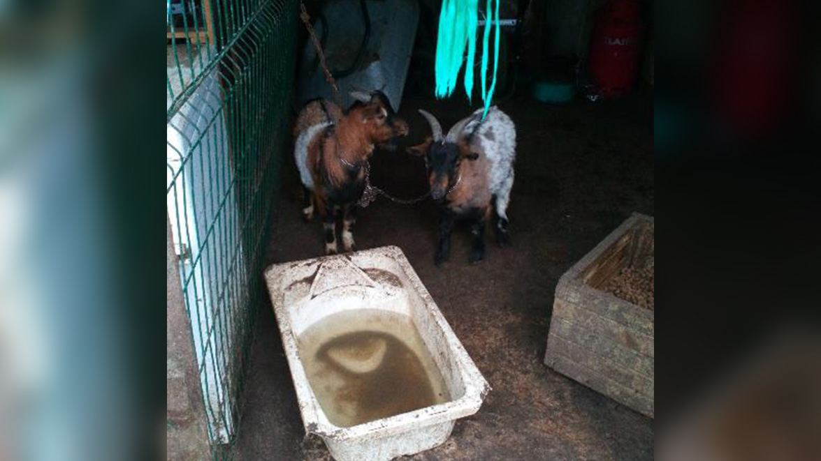 2 boucs reliés par une chaîne et 3 chats enfermés dans un poulailler