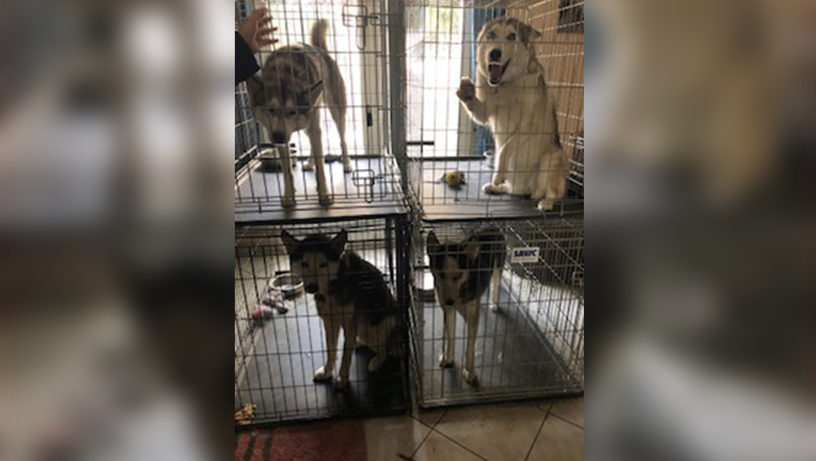 Des chiens de traîneau maigres et délaissés, enfin sortis de leur cage