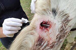 Le vétérinaire qui est intervenu pour examiner les équidés a confirmé à 30millionsdamis.fr qu’une balle de chasse était l’hypothèse privilégiée pour expliquer les graves blessures : « Les lésions sont compatibles avec une arme à feu […] Au vu des dommages, il s’agit d’un gros calibre ». Récupérée dans la cuisse du cheval, la balle devra cependant être analysée afin de confirmer cette hypothèse. « Ma présomption, c’est que la jument a été la première touchée. Le projectile métallique, après avoir traversé son encolure, a fini sa course dans les cuisses de l’autre cheval », explique le praticien.