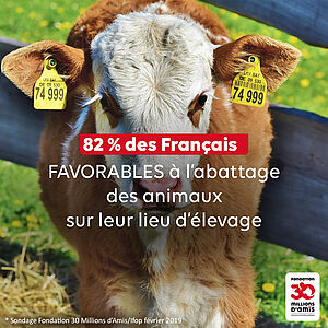 Face à de tels scandales de maltraitance dans les abattoirs, mais aussi pour éviter les souffrances liées au transport des animaux, plus de 4 Français sur 5 (82 %) souhaiteraient que les animaux d’élevage soient abattus sur le lieu de leur élevage par des professionnels (sondage Fondation 30 Millions d’Amis / Ifop 2019).