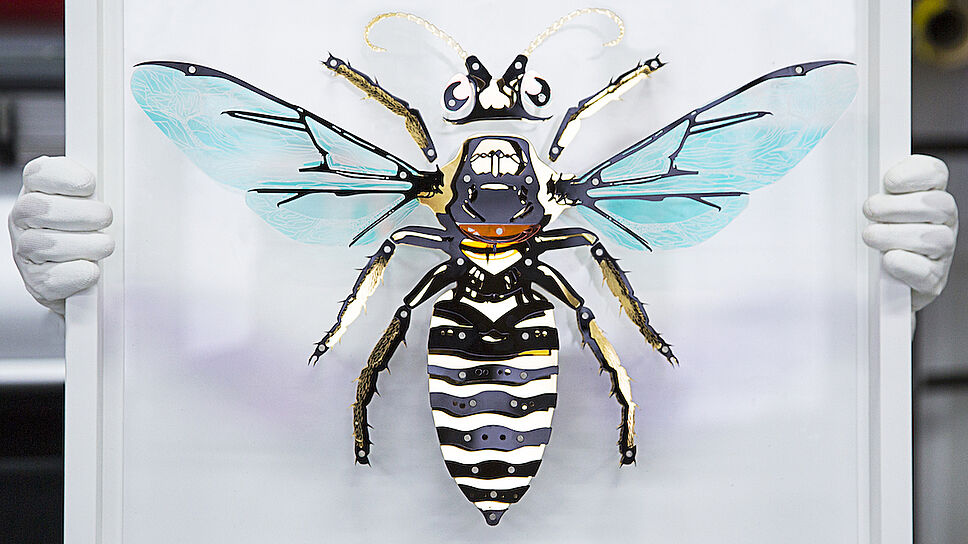 Le designer travaille désormais graphiquement sur le monde animal, en employant une technique de découpe et de superpositions de plexiglas de couleurs et recyclé. Lorsque le directeur de la YIA (Young International Art) lui propose d’exposer ses travaux au Carreau du Temple (Paris 11ème), il en profite pour créer sa première série d’oeuvres autour des insectes. « J’ai souhaité mettre à l’honneur la richesse du monde des insectes et leur disparition progressive, conséquence directe du réchauffement climatique, commente l’originaire de Ville-d’Avray (Hauts-de-Seine). Ces petits animaux sont à mon sens trop souvent négligés et pourtant au coeur de la biodiversité. Ils sont essentiels au bon développement de la planète. Mon but, c’est de les sublimer en les déclinant par une combinaison complexe de motifs, de couleurs et de transparences. »