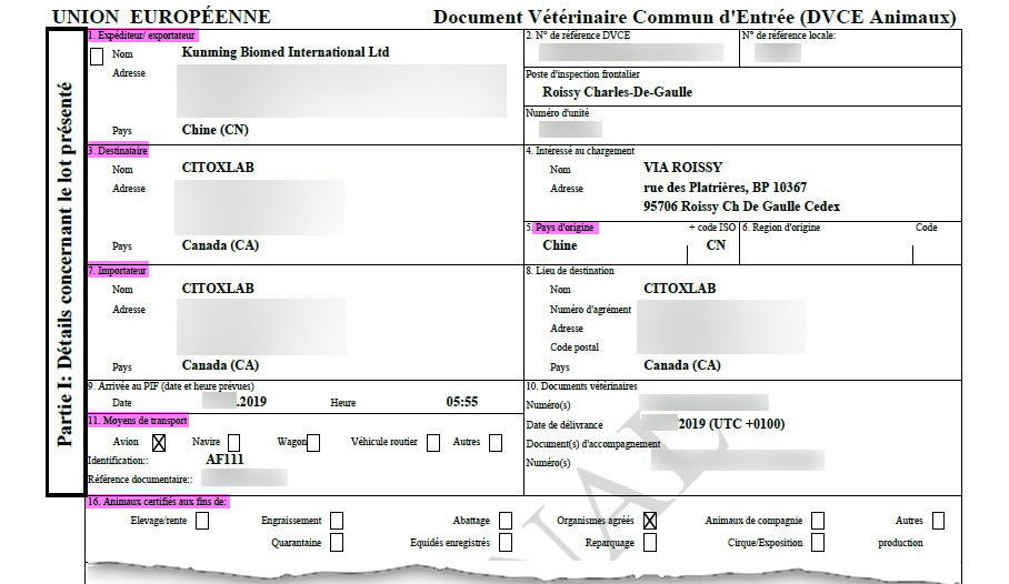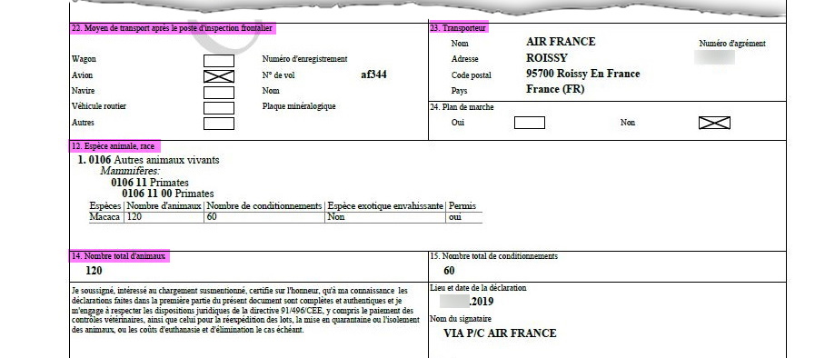 Dans les document de transport que la Fondation 30 Millions d’Amis a pu consulter (un exemple ci-dessus), l’item n°16 permet d’identifier l’utilisation prévue pour les animaux transportés (élevage, abattage, etc.). La case « organismes agréés » correspond à différents types de structures, y compris les organismes de recherche scientifique . Dans le cas présent, il s’agit bien d’un laboratoire pratiquant l’expérimentation animale.