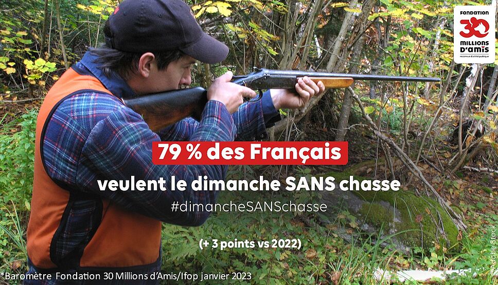 Face à cette carence, la Fondation 30 Millions d’Amis a lancé une pétition pour demander les week-ends sans chasse… seule solution à même de garantir la sécurité des promeneurs le week-end et de donner un peu de répit à la faune sauvage. Un vœu partagé par l’opinion publique puisque 8 Français sur 10 réclament cette interdiction dominicale (Baromètre Fondation 30 Millions d’Amis /Ifop, janvier 2023).