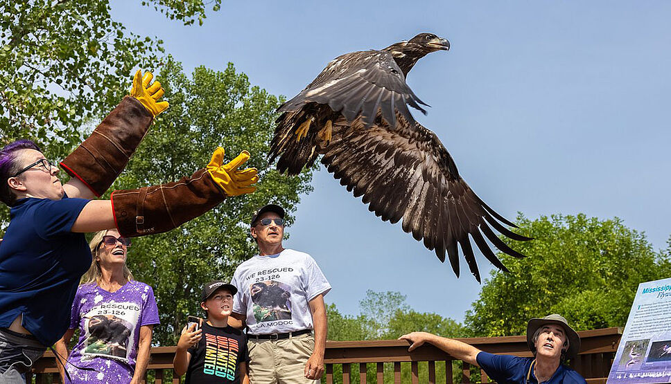 Incapable de voler, Murphy, un pygargue à tête blanche, a trouvé refuge au World Bird Sanctuary qui abrite plus de 200 animaux malades ou blessés dans le Missouri (Etats-Unis). Au printemps 2023, il a réalisé son vœu : devenir « papa poule » d’adoption. Quelques jours après avoir « couvé » un caillou, il a pris son aile un oisillon blessé, tout juste recueilli au sanctuaire. Grâce à l’aide de Murphy et au dévouement des soigneurs, le petit rapace a pu regagner la liberté cet été !