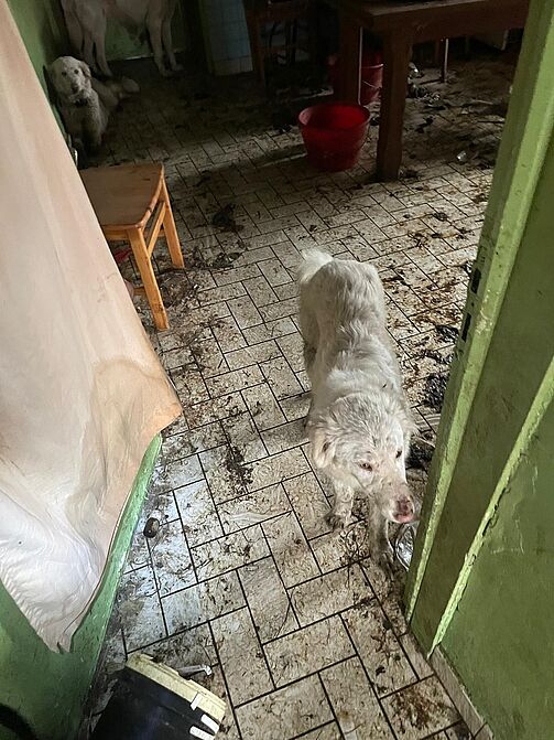 Accompagnés de la maire d’Ouvans, les enquêteurs aperçoivent « des chiens recouverts d’excréments » depuis le seuil de la maison. « Ils portaient un collier électrique et étaient maigres », décrit Claire Dufay à 30millionsdamis.fr. Après quelques échanges, le maître de ces animaux accepte de les laisser entrer. Très vite, les intervenants parcourent des couloirs remplis d’excréments, où pataugent les quatre Montagne des Pyrénées. Au fur et à mesure de la visite, les découvertes empirent : « Une porte menait à une écurie. Là, nous avons aperçu un cadavre de poney, décomposé depuis plusieurs jours. Il y avait des détritus partout, les chiens commençaient à le dévorer », continue Claire Dufay. La dépouille d’un chat reposait à côté du poney retrouvé mort.
