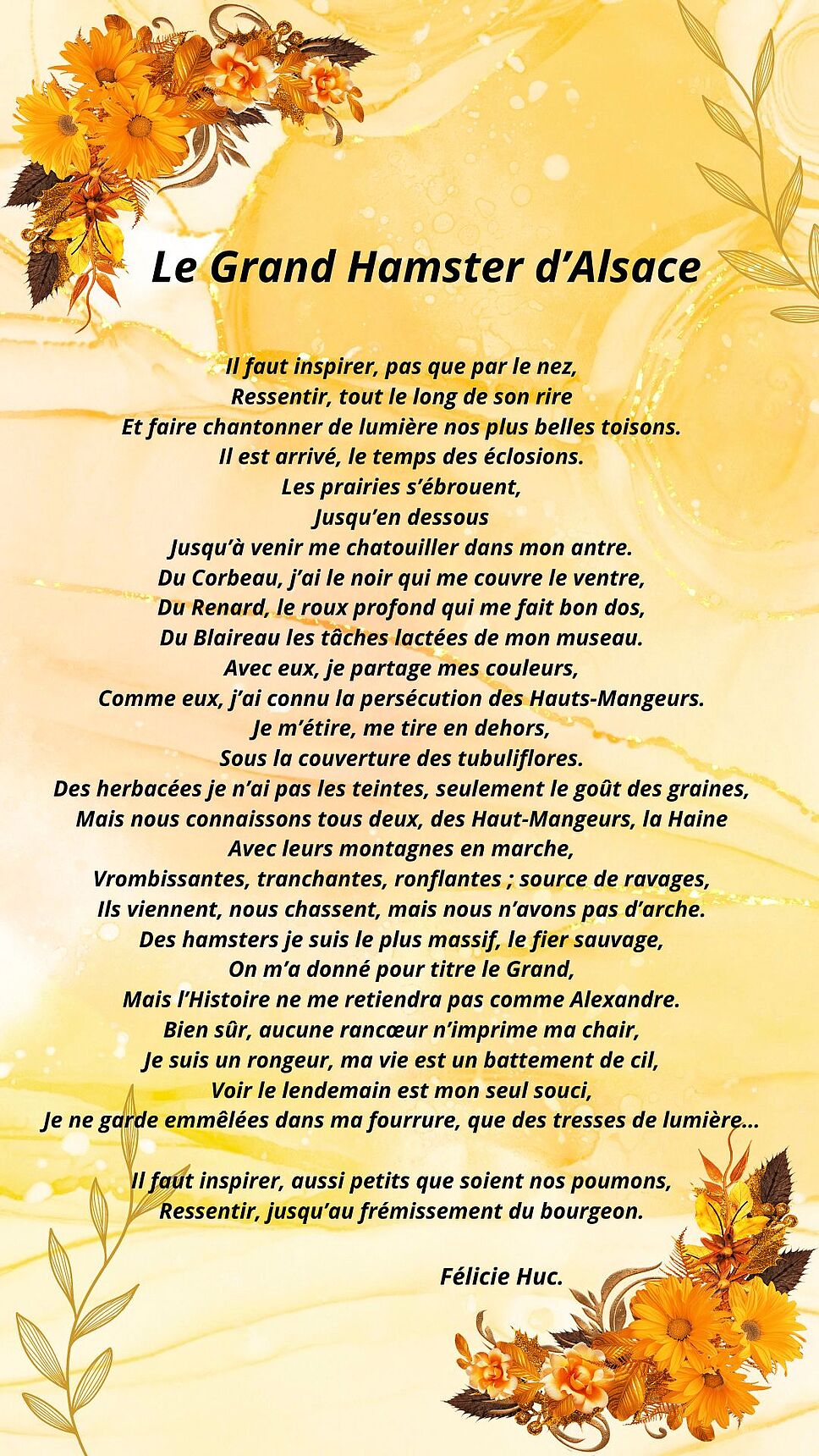 « Je suis sensible aux impacts négatifs que l’humain a sur l’environnement, sur les animaux », confie Félicie H., 20 ans, à 30millionsdamis.fr. Pour son poème, l’étudiante en sciences criminelles à l’Université de Lausanne (Suisse) s’est tournée vers le grand hamster d’Alsace, seule race sauvage en France.