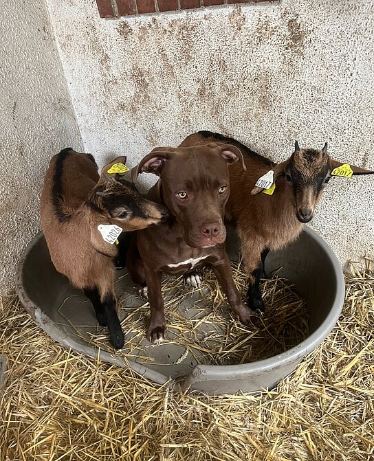 De belles amitiés qui se créent entre chiens et chevreaux. /©Justine