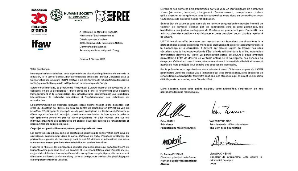 Préoccupée par le sort des protégés de ses partenaires congolais P-WAC et Lola ya Bonobo, la Fondation 30 Millions d’Amis – rejointe dans sa démarche par la Fondation Born Free, Humane Society International et IFAW – est intervenue auprès de la ministre de l’Environnement et Développement durable de République Démocratique du Congo, Eve Bazaiba.
