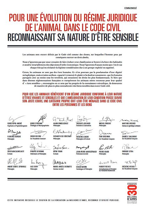 Le combat commence en 2013 lorsque la Fondation 30 Millions d’Amis organise une grande pétition demandant à la ministre de la Justice – à l’époque Christiane Taubira – de réformer le Code civil, et a publié le Manifeste des 24 intellectuels. « C’est en mobilisant nos experts et en multipliant les démarches auprès des décideurs politiques que nous sommes parvenus à corriger cette anomalie dans le Code Civil », rappelle Reha Hutin, Présidente de la Fondation 30 Millions d’Amis.