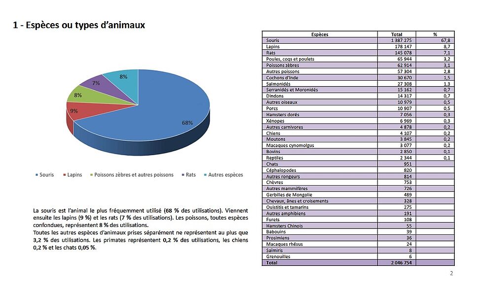 Mais le meilleur ami de l’Homme n’est pas le seul animal de compagnie utilisé comme outil de recherche. Chats, hamsters, cochons d’Inde, furets, mais aussi chevaux, ânes… aucun n’est épargné ! « On ne doit pas se satisfaire de cette baisse insignifiante du nombre d’animaux utilisés dans des procédures expérimentales, rappelle le directeur des affaires nationales et européennes de la Fondation 30 Millions d’Amis. Il est urgent d’agir sur le financement de nouvelles méthodes scientifiques qui ne recourent pas à l’animal, mais aussi de reconnaître un droit d’objection de conscience. Une nouvelle génération de chercheurs qui n’opposent plus science et conscience doit se former dès à présent »
