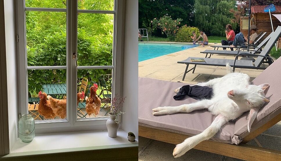 Pendant que les poules guettent à la fenêtre, l’un des boucs s’offre un moment de détente… sur le transat ! /©La Lhuiseraie