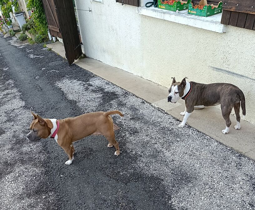 Les deux American Staff « sont très joueuses », parfois même connectées l’une à l’autre. « En ce moment, Anyaha se montre un peu différente avec Mayka, témoigne sa famille. Cette dernière a entamé une chimio car elle a un lymphome. Ayanah l’a senti et est devenue plus protectrice. »