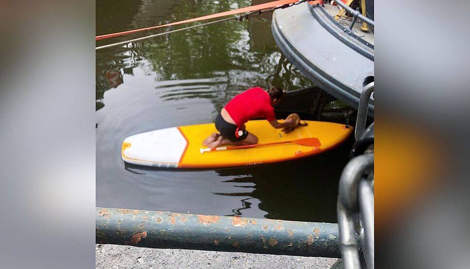 « Elle a réussi à trouver un endroit sec sur l’hélice d’une péniche. Sorti de nulle part, un voisin est apparu avec… sa planche de surf ! »