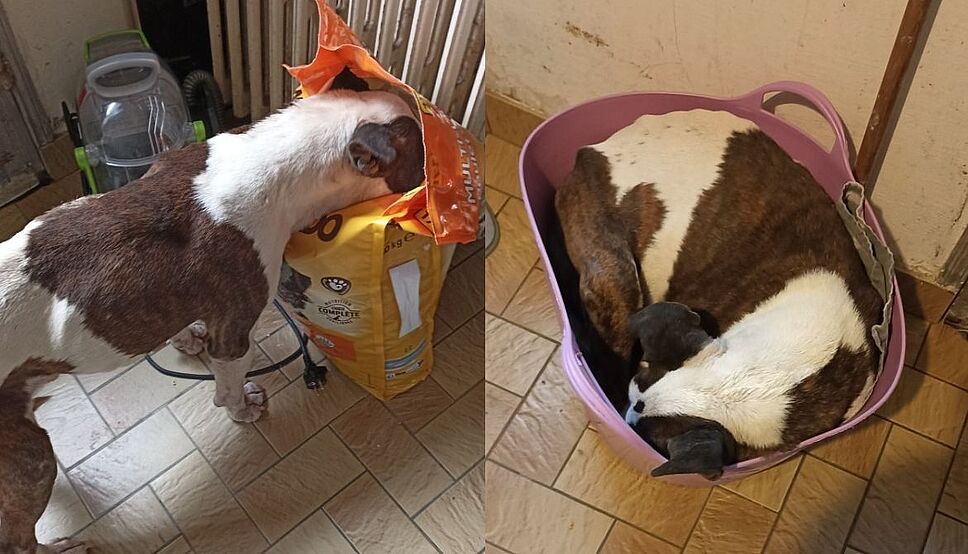Gadjete était tellement affamé qu’il a fini par se jeter dans un sac de croquettes, avant de se « cacher » recroquevillé dans une corbeille à linge. /©Maryline