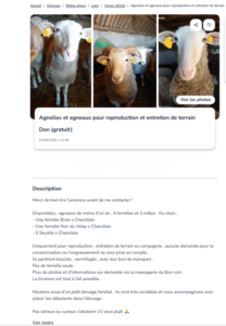 Initialement présentées comme des « dons », ces annonces précisent pourtant les prix dans un court descriptif. « Agnelles 6 mois, à partir de 160*** [les symboles « * » remplaçant « euros » : ndlr] », peut-on lire sur l’une des annonces consultées par la Fondation 30 Millions d’Amis. D’autres auteurs d’annonces, inscrits comme particuliers et non comme des professionnels, dressent leurs modalités de vente des animaux avec possibilité de « livraison » !