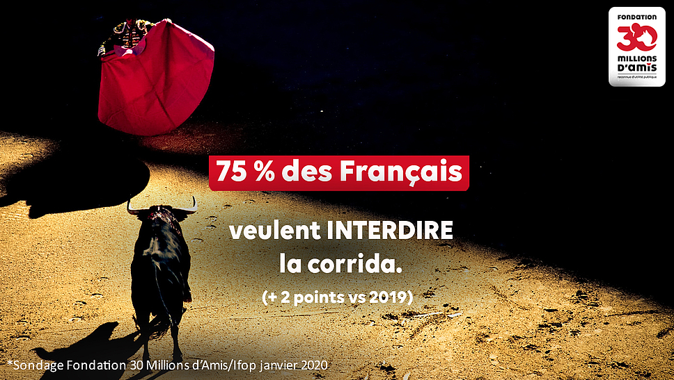 La Fondation 30 Millions d’Amis se bat depuis plusieurs années aux côtés de No Corrida et de la FLAC pour mettre un terme à cette atrocité. Alors que 75% de nos concitoyens se prononcent pour l’interdiction des corridas en France (Baromètre 2020 Fondation 30 Millions d’Amis/IFOP), la pétition de la Fondation 30 Millions d’Amis pour mettre fin à la corrida a déjà recueilli plus de 400 000 signatures. Il est urgent, dans ce contexte où nécessité fera forcément loi, que le gouvernement prenne toutes les mesures qui s’imposent pour assurer cette inévitable transition.