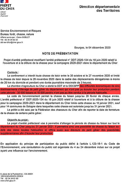 À titre d’exemple, le préfet du Cher offre aux chasseurs la possibilité de tirer sur des faisans jusqu’au 31 janvier 2021 (au lieu du 10 janvier) au vu des « difficultés économiques par les éleveurs de petit gibier qui n’ont pas pu écouler leur production pendant la période de confinement ». Ce dernier précise dans une note que « cinq établissements d’élevage de petit gibier du département » n’ont pas pu vendre leur production de « 30 000 faisans et 10 000 perdrix » ! Le préfet des Deux-Sèvres invoque, lui aussi, des « difficultés économiques de la filière » pour justifier la décision.