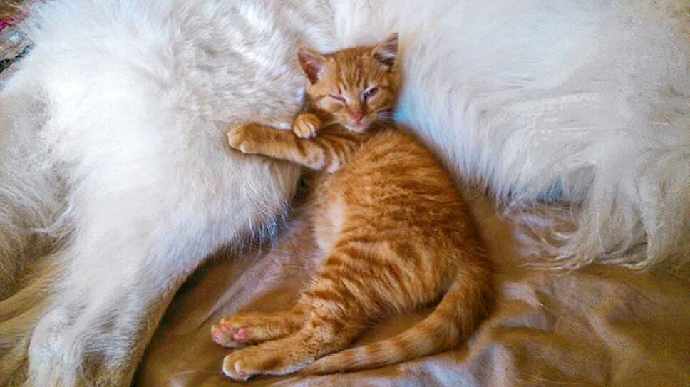 « Dès son arrivée chez nous, Azmael est tombé sous le charme de Liam, notre berger blanc suisse, sourit sa maîtresse. Il est devenu son ‘’endroit’’ préféré pour dormir ! Liam ne savait pas trop quoi faire de ce chaton. Il se demandait si c’était un jouet ou de la nourriture….