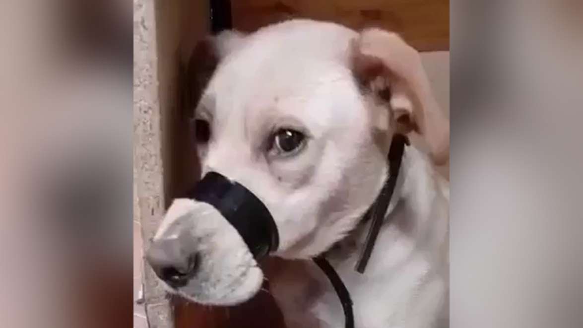 Dans une vidéo récupérée par la Fondation 30 Millions d’Amis, Roxane, une chienne croisée labrador âgée d’un an et demi, est assise sagement sur un tapis... le museau entouré de bande adhésive ! ©DR