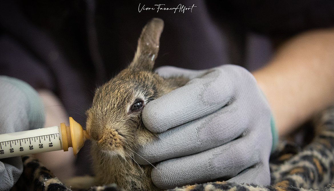 Une bénévole du centre Faune Alfort biberonne un lapereau de garenne qui avait été retrouvé très affaibli, déshydraté, avec une conjonctivite. ©Vivre Faune Alfort