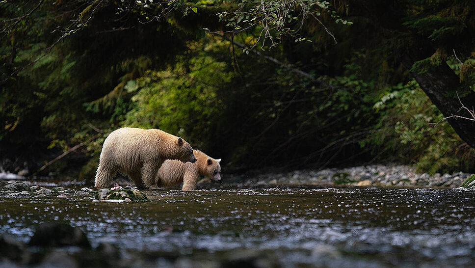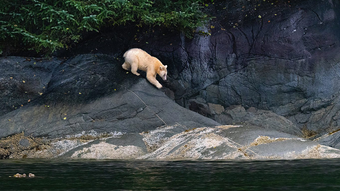 Les Premières Nations le savent pertinemment : « Elles ne voient pas leur territoire comme un lieu de vie mais comme un élément qui les nourrit, d’un point de vue culturel et alimentaire, assure le photographe. Leur culture est fondée sur la protection des éléments de la nature et des animaux ». Parmi ces animaux, les ours « esprit » revêtent une importance hautement symbolique. Ces ours noirs révèlent une robe blanche-crème, parfois orangée, qui rend leur observation d’autant plus émouvante.