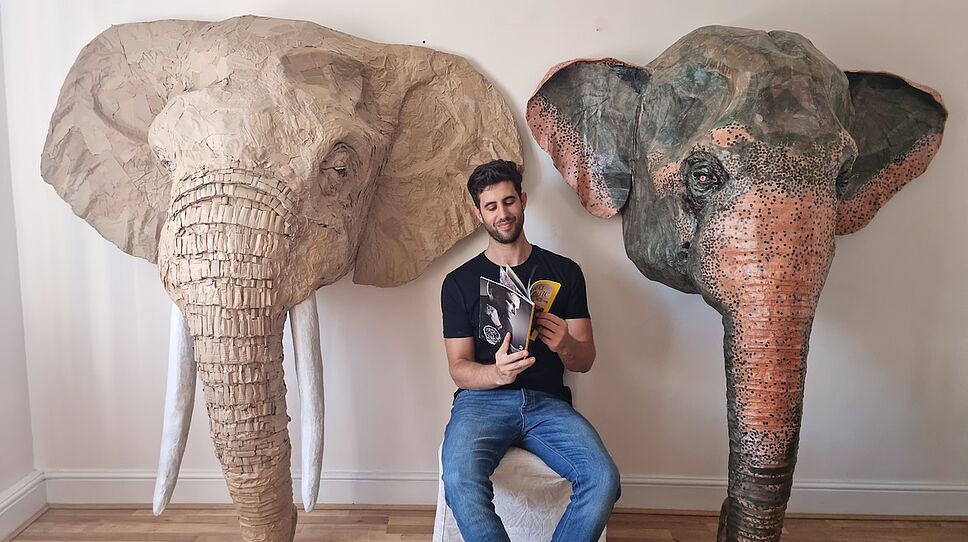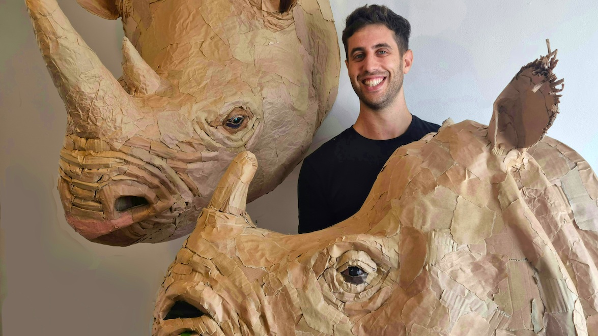 Josh Gluckstein, ici avec ses rhinocéros en carton, veut sensibiliser les amateurs d'art à la protection des espèces animales./©Josh Gluckstein