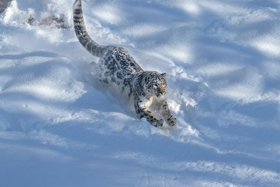 L’animal possède un corps athlétique ! Sa carrure, adaptée aux pentes montagneuses, lui permet de bondir jusqu’à 15m de long, soit sept fois sa taille ! Une longueur tenace qui lui assure, grâce à ses pattes avant, plus petites qu’à l’arrière, plus de rapidité. Sa queue, la plus grande et dense des félins, l’aide quant à elle à garder l’équilibre lors de ses sauts immenses. Et lorsque l’animal retombe au sol, elle ne subit aucun impact ! Comment ? Grâce à sa large poitrine la protégeant du moindre choc.
