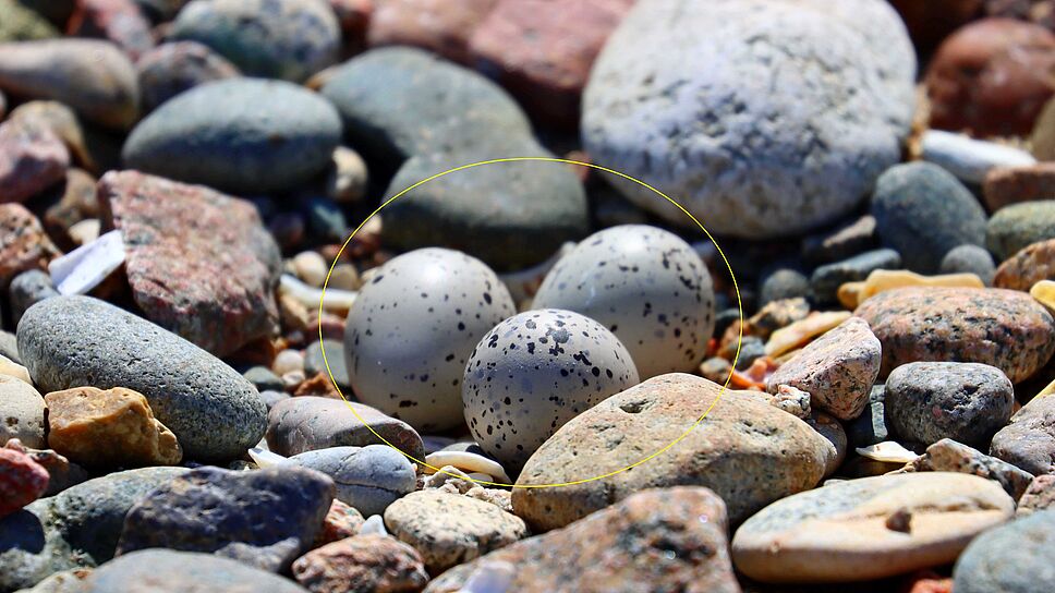 Les oiseaux construisent des nids très simples, directement en déplaçant parfois quelques galets et coquillages. Les œufs sont alors confondus avec l’environnement. /©Conservatoire du littoral
