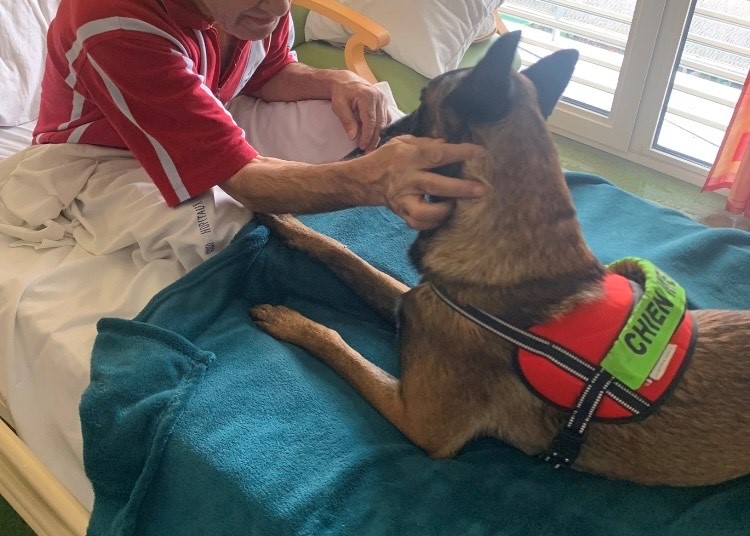« Vous avez vu le chien, il est joli ? », lance Anaïs à une patiente. Cette dernière est un peu craintive mais souhaite tout de même que Tokyo reste dans sa chambre. « Elle ne vient pas vous voir, elle respecte, si vous avez peur elle ne vient pas, elle reste loin de vous, d’accord », ajoute Anaïs pour la rassurer, en montrant sa chienne qui reste sagement sur une chaise. Puis le rapprochement se fait doucement… « Vous voulez un petit peu la caresser ? » La réponse est « oui ». Tokyo descend et s’approche alors délicatement de la patiente. La mission est accomplie.