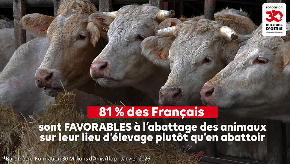 Le dernier baromètre annuel de la Fondation 30 Millions d’Amis mené avec l’Ifop, publié en janvier 2026, a révélé que 92 % des Français sont favorables à la vidéosurveillance dans TOUS les abattoirs, et que 81 % sont favorables à l’abattage des animaux sur leur lieu d’élevage plutôt qu’en abattoir.