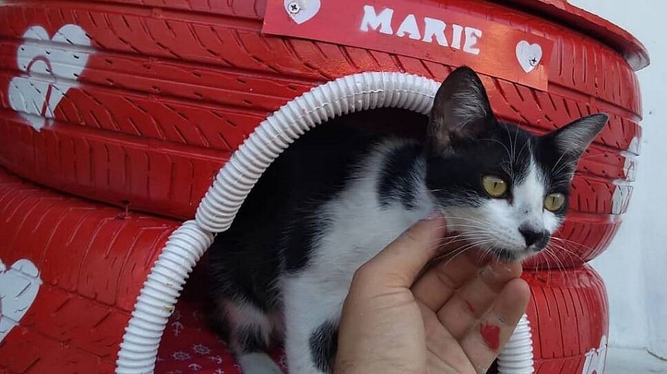 Avec ses pneus réutilisés en paniers pour chiens et chats, Amarildo Silva fait le bonheur de plusieurs familles... et de l'environnement. /DR
