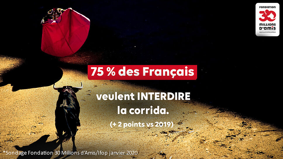 75 % (+2 pts vs 2019) de nos concitoyens se prononcent pour l’interdiction des corridas en France. La pétition de la Fondation 30 Millions d’Amis pour interdire définitivement la corrida en France a déjà recueilli près de 400.000 signatures.