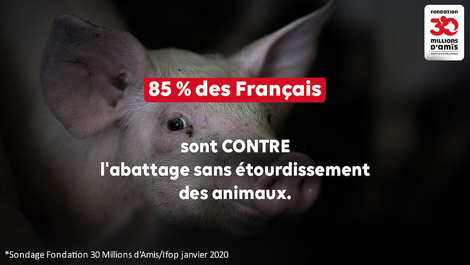 De son côté, la Fondation 30 Millions d’Amis réclame l’interdiction stricte de l’abattage sans étourdissement préalable, une mesure soutenue par 85 % des Français (baromètre 30 Millions d’Amis/Ifop, 2020) et préconisée par le Conseil économique, social et environnemental (CESE) dans un récent rapport (« Les enjeux relatifs aux conditions d’élevage, de transport et d’abattage en matière de bien-être animal », 2019). Elle demande également au ministre de l’Agriculture Didier Guillaume de généraliser l’abattage des animaux sur leur lieu d’élevage, auquel 83 % de nos concitoyens se disent favorables (baromètre 30 Millions d’Amis/Ifop, 2020).
